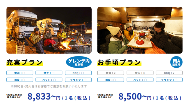 ・お手頃プラン: 南A駐車場を利用。焚火や電源は利用できませんが、価格を抑えてとことん滑りたいアクティブな方におすすめです。